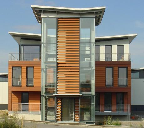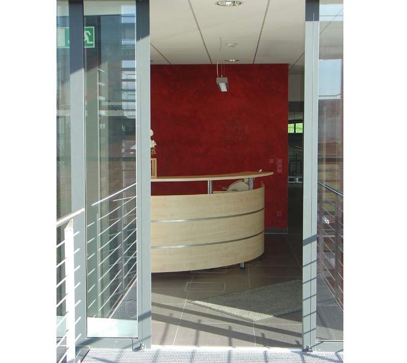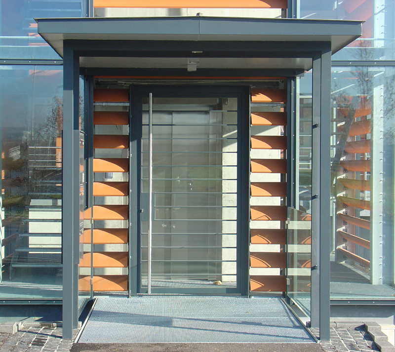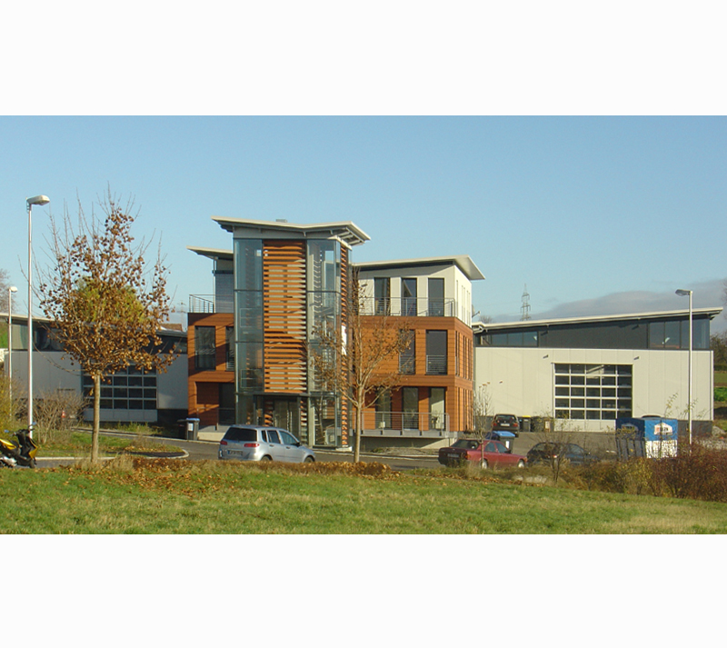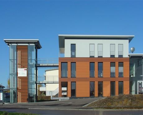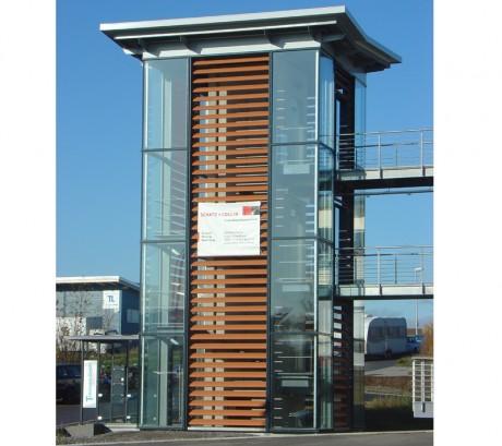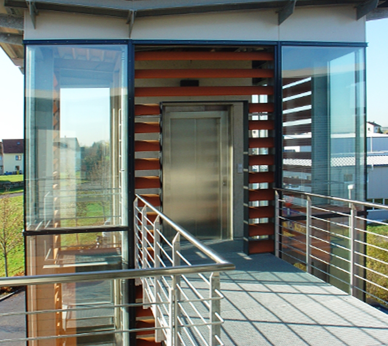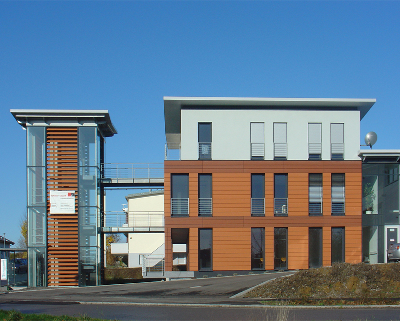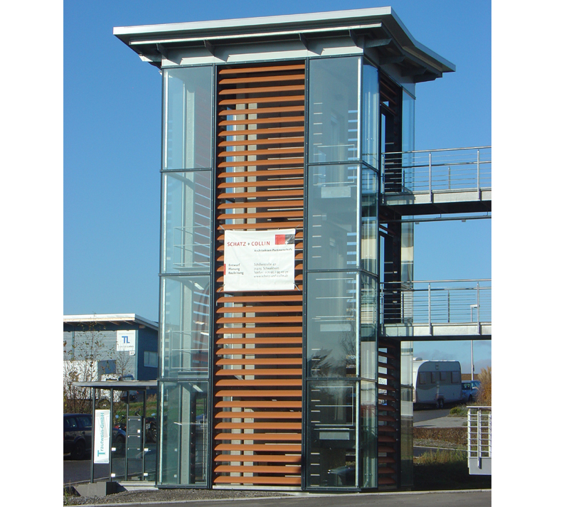 GewerbebauVerwaltungsgebäude mit Penthouse und Produktionshalle in SchwaikheimAus dem Wunsch der Bauherrschaft nach einem repräsentativen Bürogebäude mit ausgelagertem Treppenhaus, einer funktionellen Produktionshalle sowie einer Wasserfläche im Freibereich entstand die Idee des - im Wasser - freistehenden Treppen- und Aufzugsturmes. Vom Turm aus werden über zwei Brücken die Büroetage und das Penthouse erschlossen. Im Erdgeschoss sind die Sozialräume untergebracht. Auf der Terrasse am Schwimmteich können die Mitarbeiter ihre Arbeitspausen in angenehmer Atmosphäre verbringen. |